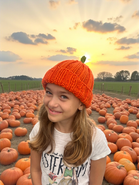 Die Mütze leuchtet in einem kräftigen Kürbis-Orange, das sofort gute Laune macht. Die Rippenstruktur erinnert an die typischen Kürbisse im Herbst, der kleine grüne Stängel rundet das Design charmant ab. Ein Hingucker für Kinder und Erwachsene – warm, bequem und einfach gemütlich.