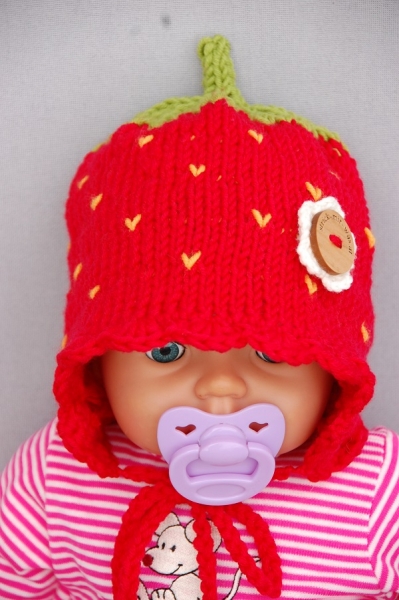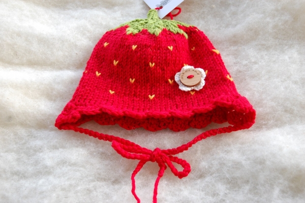 Diese entzückende und originelle Erdbeerhaube wird aus einer 100 % Öko-Merino-Wolle (streng auf Schadstoffe geprüft, garantiert mulesing-frei) gestrickt, ist kuschelig weich zu tragen und hält gleichzeitig schön warm. Standardmäßig wird die Haube für Kinder im Alter von ca. 5 Monaten (Kopfumfang ca. 43 cm) erstellt. Geben Sie bitte den Kopfumfang des Kindes an, dann passt die Haube ganz genau!